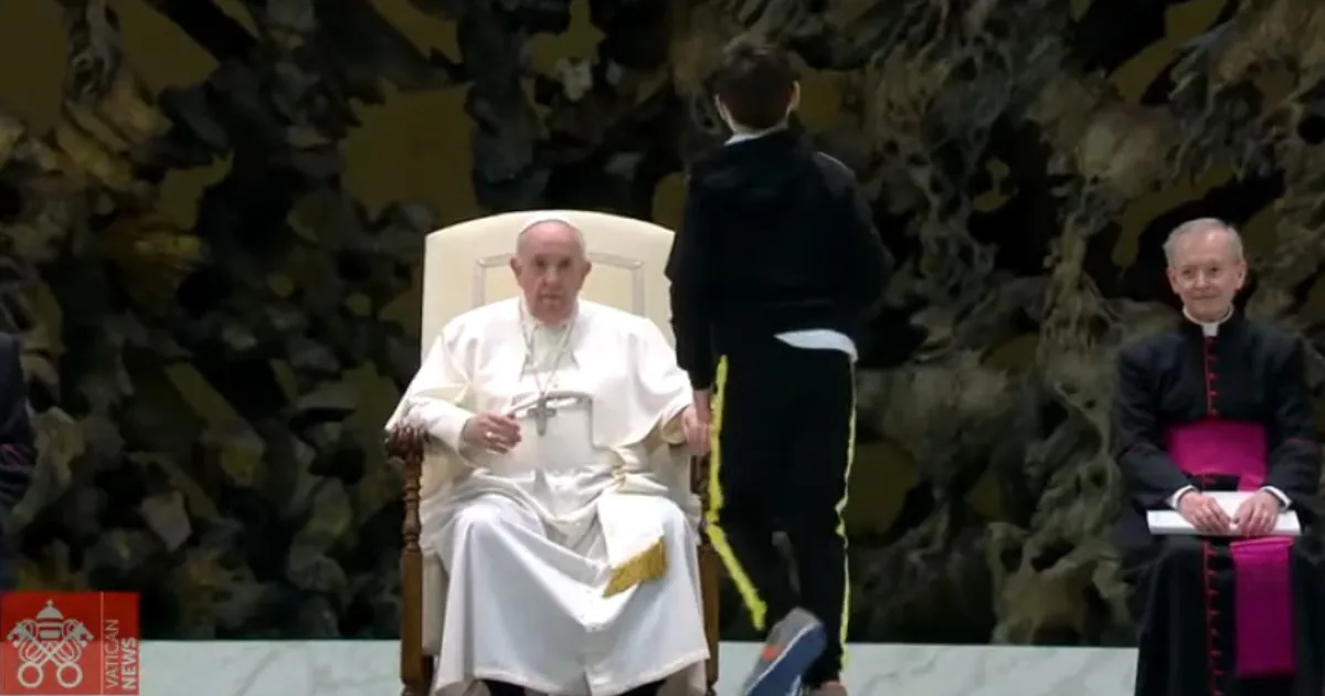 Momento allo stesso tempo divertente e commovente in Vaticano prima dell’udienza generale di Papa Francesco in Aula Paolo VI. Un bambino è salito sul palco, superando la sicurezza, e avvicinandosi al Pontefice. Il Santo Padre lo ha prima fatto sedere al suo fianco. Poi il piccolo è sembrato come attratto dallo zucchetto papale, al punto da prendere per mano un prete e mostrarglielo da vicino.