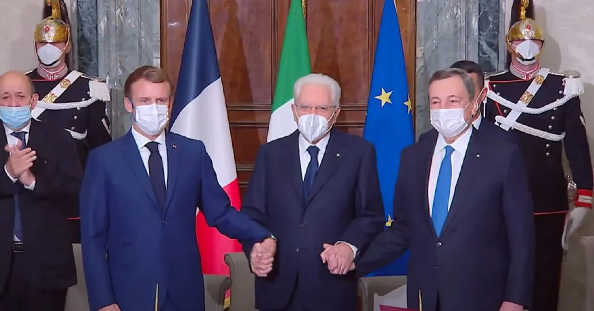 Il momento delle firme del Trattato del Quirinale tra Emmanuel Macron e Mario Draghi è stato caratterizzato da un curioso fuoriprogramma. E’ stato il leader dell’Eliseo a coinvolgere il presidente Sergio Mattarella e a prenderlo affettuosamente per mano. Al gesto si è unito anche il premier Draghi. Sul finire del video si può osservare con quanto calore il presidente del Consiglio abbia stretto la mano del capo dello Stato in segno di stima, ma probabilmente anche di affetto.