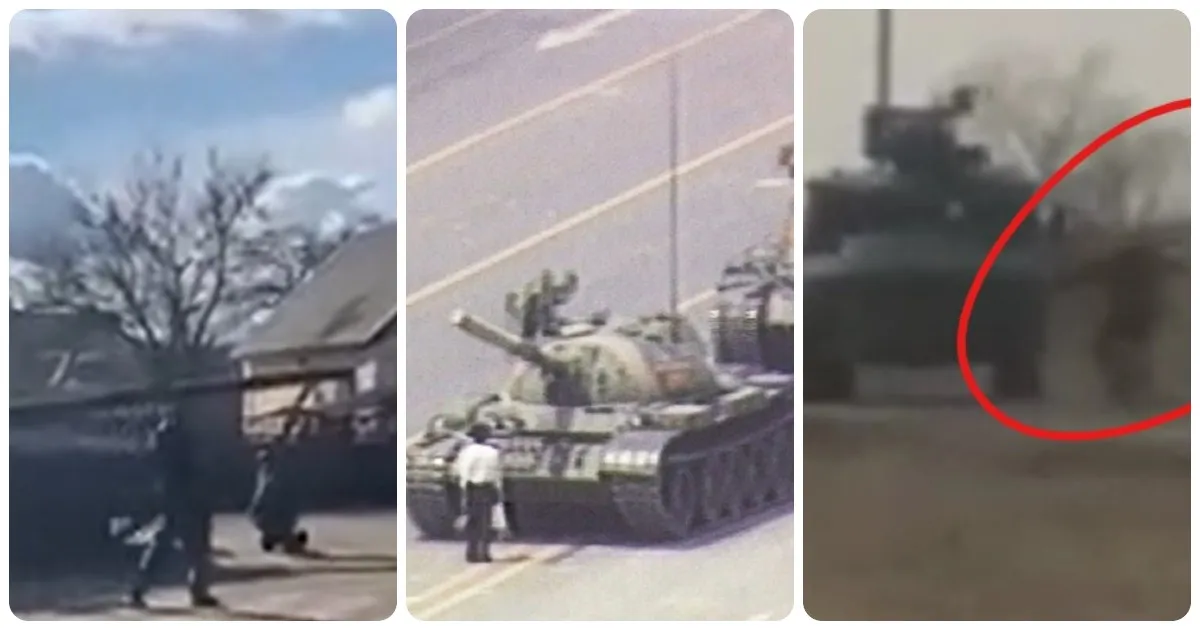 Quelle che stanno diventando virali in queste ore sono immagini che portano alla mente il “Rivoltoso Sconosciuto“, anche noto come “Tank Man“, il giovane che il 5 giugno 1989 sfidò – e vinse – col suo solo corpo la fila di carri armati cinesi all’indomani del massacro in Piazza Tienanmen.