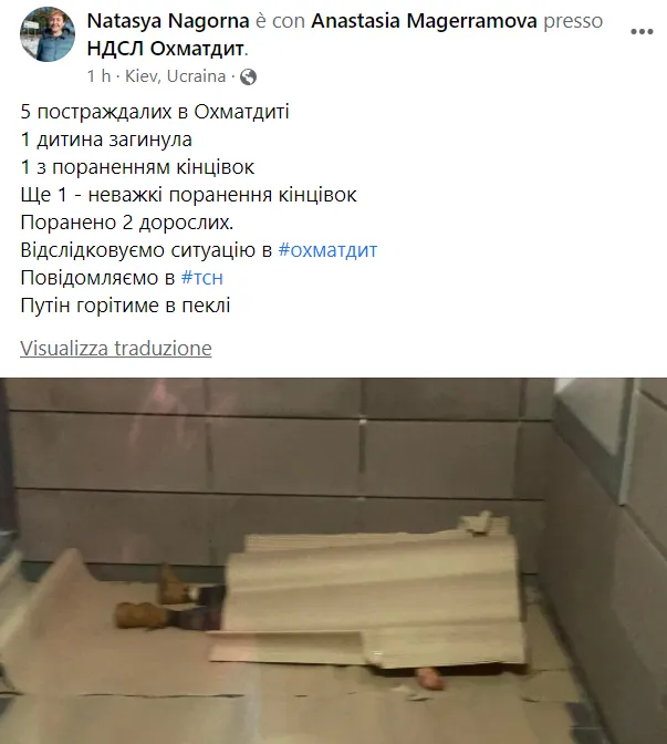 La guerra che uccide gli innocenti. Anche i più innocenti di tutti. È di pochi minuti fa una notiza terribile: secondo quanto riportato da TSN e rilanciato dal The Kiyv Independent, i bombardamenti dell’artiglieria russa hanno colpito l’ospedale oncologico pediatrico Okhmadyt della capitale e ucciso un bambino.