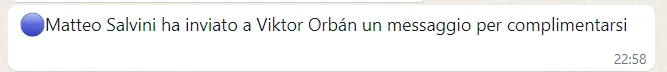 Salvini non si trattiene. Chiama due volte per nome il primo ministro ungherese – “Bravo Viktor!” e “Forza Viktor” – così comunicando che il successo di Orban è anche il suo. Impressione corroborata dalla comunicazione leghista, che due minuti prima delle 23:00 invia sulle chat Whatsapp dei giornalisti questo messaggio: