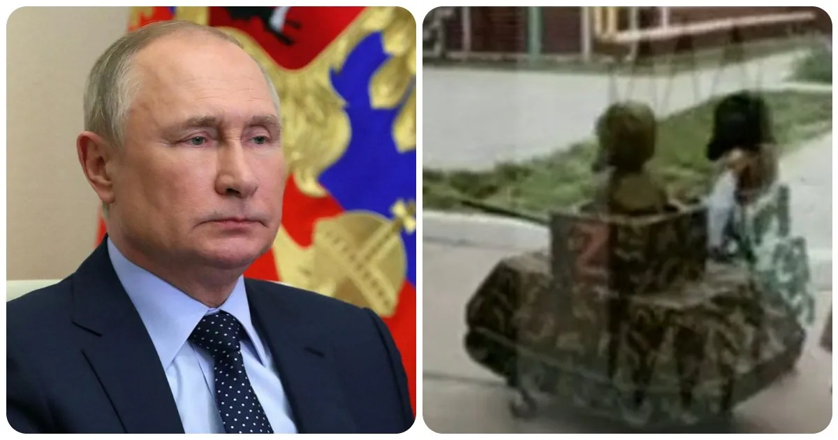 I bambini in tenuta militare marciano a ritmo di musica, sono posti alla guida di carri armati di cartone, sulle cui fiancate è incisa la “Z” universalmente riconosciuta come simbolo della “operazione speciale” russa in Ucraina.