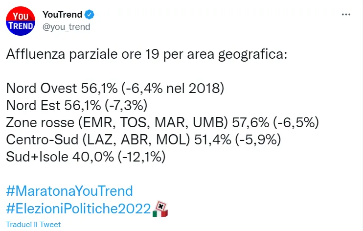 Il 40% dell’affluenza tra Sud e Isole è un dato impietoso: al Meridione siamo in piena emergenza democratica. C’è chi invoca il maltempo, chi si riserva di aspettare il dato definitivo delle 23:00, ma sembra evidente lo scarto rispetto al resto del Paese. Comprendere chi ha votato in quelle regioni significherà (anche) avere un’idea sull’esito della partita nazionale.