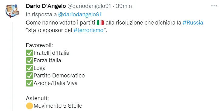 Il Parlamento europeo ha approvato pochi minuti fa la risoluzione per riconoscere la la Russia come “stato sponsor del terrorismo”: 494 i sì, 58 no, 44 astenuti, fra cui tutta la delegazione del Movimento 5 Stelle.