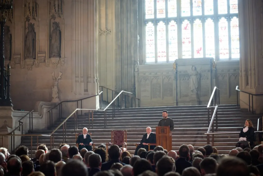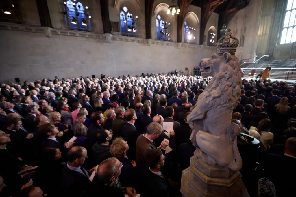 Nella magica atmosfera di Westminster Hall, dinanzi al “popolo del Regno Unito e i suoi onorevoli rappresentanti!“, idealmente al cospetto di tutti i popoli dell’Inghilterra e della Scozia, del Galles e dell’Irlanda del Nord” e di “tutte le terre che hanno ospitato anime coraggiose da quando l’Europa è nata“, Volodymyr Zelensky pronuncia un discorso destinato ad entrare nella Storia.