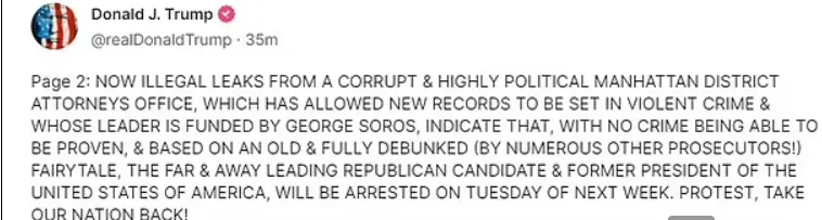 La procura distrettuale di Manhattan è in procinto di incriminare Donald Trump per la vicenda riguardante Stormy Daniels, la pornostar che l’ex presidente avrebbe pagato nel 2016 con l’obiettivo di farla tacere sulla loro fugace relazione. Ma il leader dei Repubblicani entra a piedi uniti sulla questione e con un post pubblicato su Truth invita gli americani a scendere in strada per “riprenderci il nostro Paese“. Un tentativo di sobillare le proteste in piena regola, con il tycoon pronto a dichiarare che “fughe di notizie illegali da un ufficio del procuratore distrettuale di Manhattan corrotto e altamente politicizzato, che ha consentito nuovi record di crimini violenti e il cui leader è finanziato da George Soros, indicano che, senza che un reato possa essere provato, e sulla base di una vecchia e pienamente smentita (da molti altri procuratori!) favoletta, il candidato repubblicano di gran lunga più importante ed ex presidente degli Stati Uniti d’America, sarà arrestato martedì prossimo. Protestiamo, riprendiamoci la nostra nazione!“.