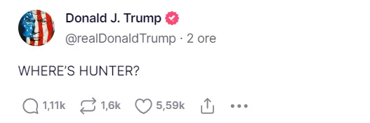 Trump cercherà di trascinare nel fango l’intera politica americana: è su quel terreno che è apparso fino ad oggi imbattibile. Chiedere ad Hillary Clinton, per nozioni in merito. Joe Biden, che nei suoi cinquant’anni di politica attiva ne ha viste di ogni, ha chiara la portata della sfida. Lo si è intuito dall’assenza di dichiarazioni a caldo sull’argomento. Meglio lasciare sbollire, non surriscaldare una vicenda ad alto tasso di infiammabilità. Sarà l’altro a cercare di tirarlo giù con sé. Anzi, ha già iniziato: la “persecuzione politica” e la “caccia alle streghe” che ha già denunciato sono animate dai Democratici, ha detto. Si è spinto pure oltre. Un’ora fa, in piena notte americana, Trump ha scritto su Truth: “Dov’è Hunter?“. Si riferisce al figlio del presidente, alla “pecora nera” fonte di perenne imbarazzo della famiglia Biden, nel corso degli anni divenuta ossessione dei Repubblicani complottisti.