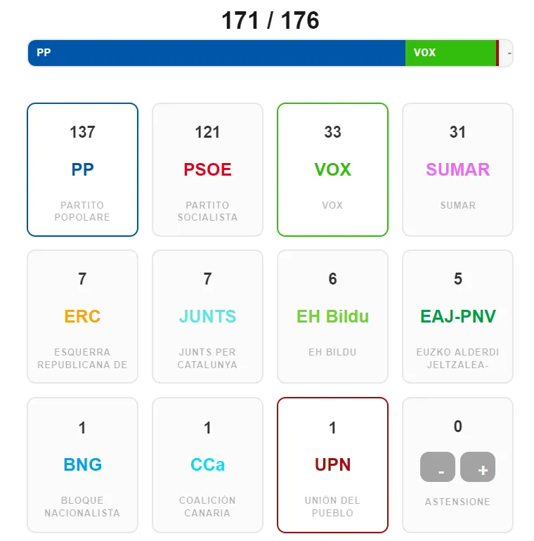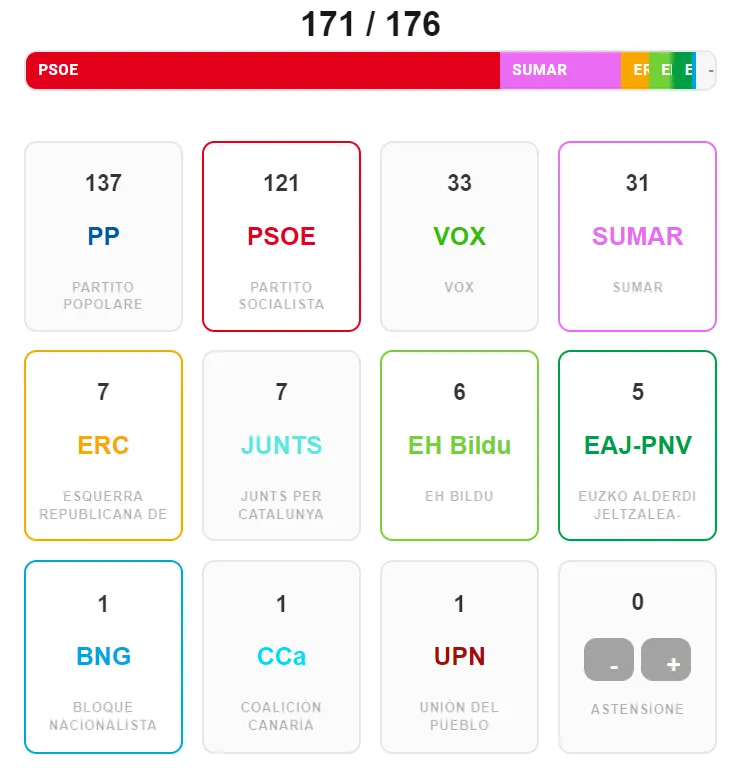 Ricordate il pallottoliere? Eravamo rimasti al 171 pari delle coalizioni guidate da Feijóo e Sánchez. Chi si aggiudica il voto di Cristina Valido sale a quota 172.