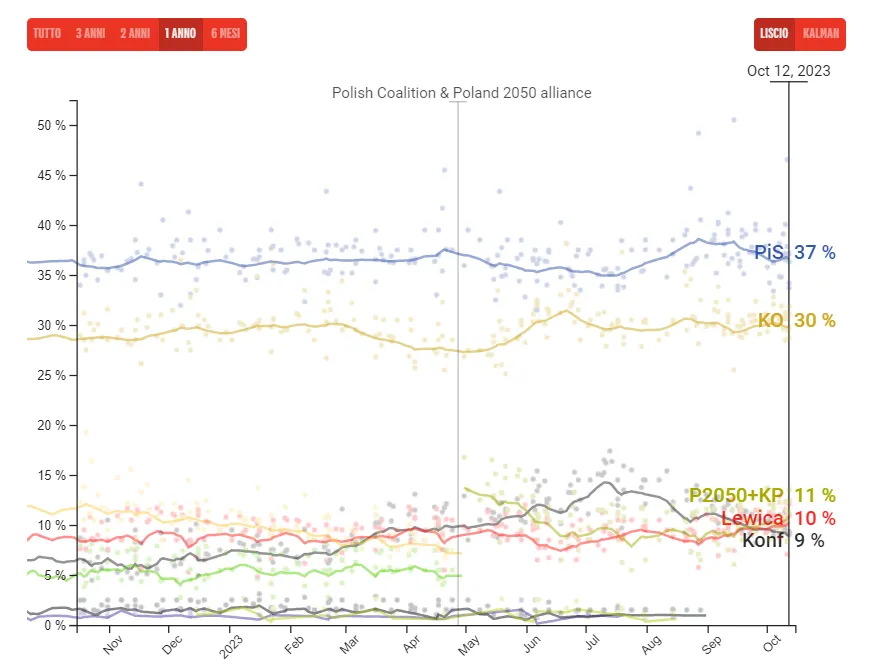 Cosa dicono i sondaggi della vigilia? La media di POLITICO attribuisce agli ultra-conservatori, oggi al governo, il 37% dei consensi. La coalizione di Tusk insegue al 30%. Tutto finito? Affatto, perché l’ago della bilancia è rappresentato dalle liste che lottano per restare al di sopra della soglia di sbarramento posta all’8% per le coalizioni e al 5% per i partiti che hanno scelto (per ora) la corsa solitaria.
