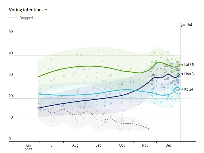 Secondo la media dei sondaggi fornita da Economist, al momento Lai è con il 36% di poco in vantaggio su Hou (31%). Ko insegue al 24%. Si tratta di dati aggiornati al 1° gennaio, passibili dunque di essere smentiti.