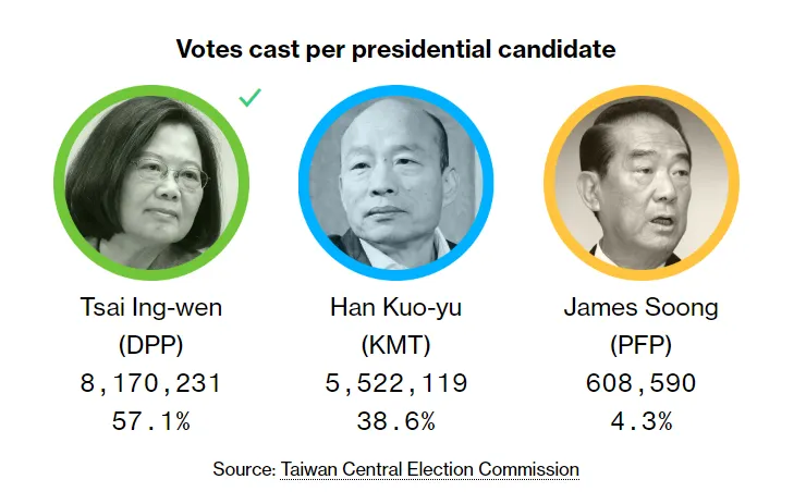 Il sistema elettorale taiwanese per le presidenziali è molto semplice: gli elettori votano per un ticket (presidente + vice). Vince chi prende più voti, indipendentemente dall’affluenza e dalla percentuale di consensi ottenuta. Nel 2020 Tsai si impose con il 57,1% contro il 38,6% del candidato del Kuomintang.