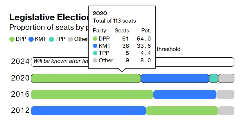 In palio ci sono 113 seggi: 73 vengono assegnati con il maggioritario (vince chi prende un voto in più), 6 sono riservati ai candidati delle popolazioni indigene, gli altri 34 vengono distribuiti con metodo proporzionale (soglia di sbarramento al 5%). Quattro anni fa il DPP di Tsai ottenne la maggioranza semplice per 4 seggi.