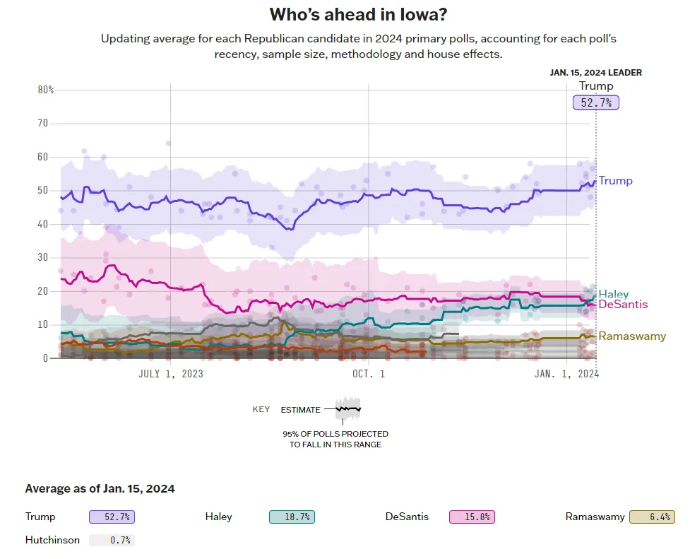 Nella storia del Partito Repubblicano nessun candidato ha mai vinto in Iowa con uno scarto superiore ai 13 punti sul secondo. Oggi la media dei sondaggi dice questo: